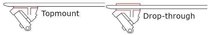 Pour les montages en «drop-through », la base du truck se trouve au-dessus de la planche. Les trucks sont donc montés à travers la planche, de ce fait, le centre de gravité est plus bas. Ce montage de trucks est idéale pour la vitesse ou le freeride puisqu’on gagne en stabilité et la poussé est facilité.